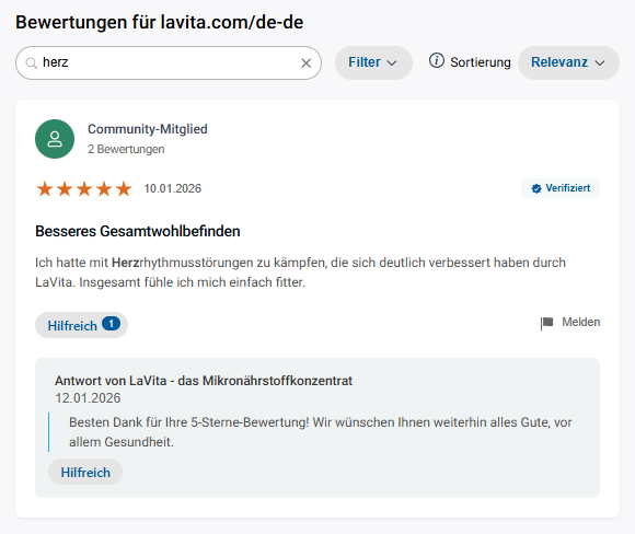 4. Trusted Shops: LaVita – das Mikronährstoffkonzentrat; https://www.trustedshops.de/bewertung/info_X49E710FC236D0FD6604F8259314C8A7F.html?searchTerm=herz ↩︎